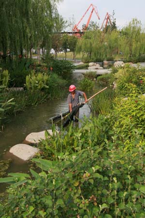 園林工人正在世博公園里清理水中的青苔。新華社記者 任瓏 攝影報道