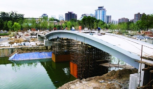 歷經數月的建設,北京通惠河國貿段南岸的景觀公園初見端倪。三環東西兩側新建的兩座拱橋橫跨通惠河,方便了行人進出公園,廣場雕塑、親水平臺、園林小品等也已經基本完工。據了解,此地為“城中村”拆遷工程,新建公園名為慶豐公園,占地約26.7公頃,西至三環路以西1100米,東至三環路以東600米,是為新中國成立60周年獻禮的重點工程。