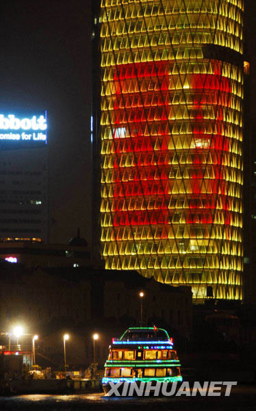 黃浦江北外灘一大樓用燈光呈現漢字“國慶”字樣