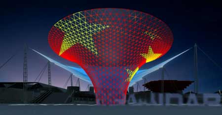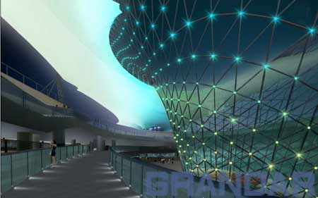 世博軸藝術燈光景觀方案中,考慮到世博軸周圍環境特點和所處位置的重要性,以及視點對整體效果的要求,我們在張拉膜和陽光谷燈具安置的位置上和角度的調節上,做了細致而又可控的安排,在陽光谷節點上布置的LED星光燈以及在頂部布置的太陽能LED星光燈,不僅在近視點能產生精致的藝術效果,在中遠視點也能形成極為震撼的藝術形象。