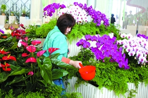 昨日,花博會北京展廳,工作人員正在為鮮花澆水。