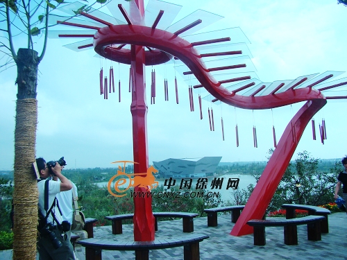 “落雨聽(tīng)琴景觀是整個(gè)徐州展園的重點(diǎn)。該景觀在山頂設(shè)立一個(gè)現(xiàn)代形式的休閑亭,取名觀雨亭!崩钤茘s介紹,亭中間放置琴臺(tái),亭子檐口設(shè)計(jì)集水槽,水由屋檐落入鋪裝在亭子周?chē)陌疾壑,從而形成雨簾;亭子前設(shè)置景石堆砌的花池,池中栽植各種花卉;亭周?chē)愿叽髥?a href="http://plant.www.yjyx.net" target="_blank" title="植物">木為背景,在藍(lán)天綠樹(shù)的襯托下,令觀雨亭更富藝術(shù)魅力。“值得一提的是,在亭的檐口,我們掛上了各種銅質(zhì)的風(fēng)鈴。即使在無(wú)雨的日子里,一樣可以聽(tīng)到風(fēng)鈴發(fā)出的‘雨聲’!
