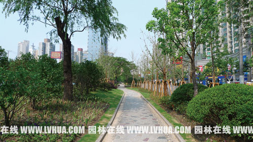 而在整治手法也是相當簡潔,使原本平坦、呆板的地形變得起伏、具有動感。同時在植物色彩搭配上強調(diào)整體感,大色塊對比,樹池有序分局,營造了綠韻深深的公共生態(tài)空間。