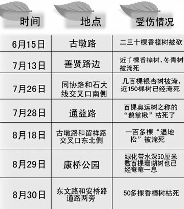 僅僅從本報96068熱線平臺記錄的讀者報料信息查詢,就可以發(fā)現(xiàn),自今年6月份入夏至今,杭州城區(qū)樹木遭殃事件頻發(fā),大批樹木死亡。6月15日,三十棵香樟樹無故被砍;7月13日,近千棵香樟樹、冬青樹被淹死;7月26日,幾百棵銀杏樹被淹,近150棵樹已經(jīng)淹死;7月28日,百棵奧運樹之稱的“鵝掌楸”枯死了等等,短短數(shù)月,僅本報選擇報道過的就有8起之多(詳見本版圖)。
