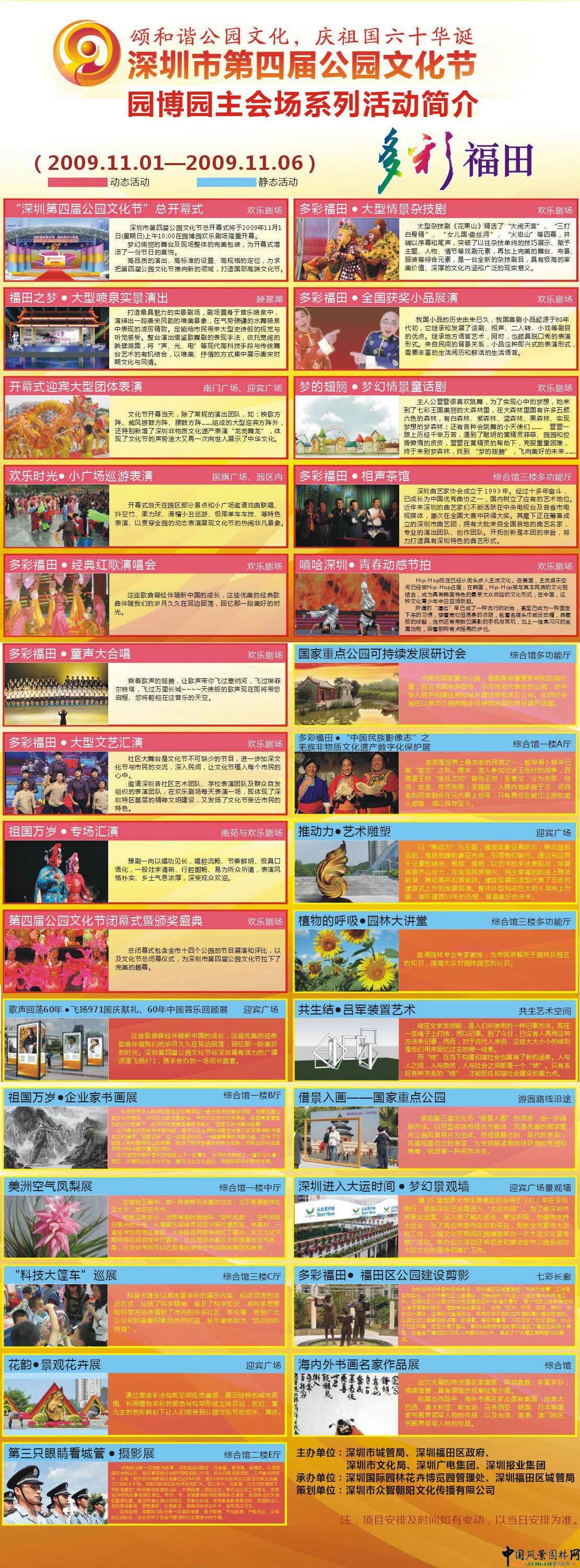 09年福田區(qū)政府將作為園博園主會場活動的共同主辦單位,全面參與公園文化節(jié)主會場活動的組織工作,向市民呈現(xiàn)高品質(zhì)的活動項目。具體內(nèi)容有:福田之夢·大型噴泉實景演出、多彩福田·社區(qū)大型文藝匯演、多彩福田·相聲茶館、多彩福田·童聲大合唱、多彩福田·經(jīng)典紅歌演唱會、多彩福田?大型情景雜技劇、多彩福田?全國獲獎小品展演。
