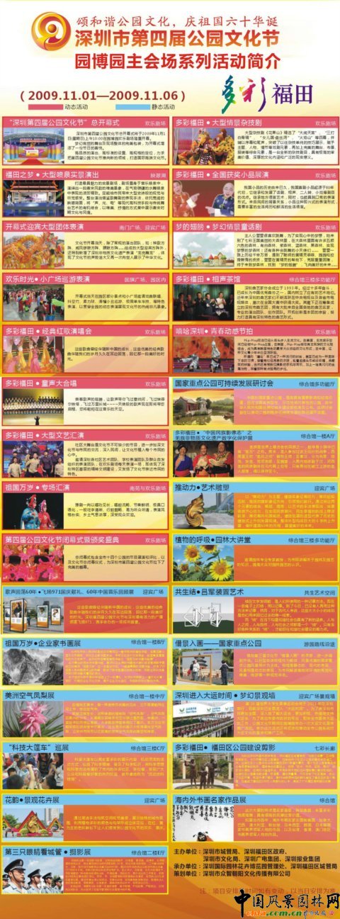 2009年是建國60周年的喜慶之年,是戰(zhàn)勝金融危機,確保社會經(jīng)濟穩(wěn)步發(fā)展的關鍵一年。為深入學習實踐科學發(fā)展觀,鞏固和發(fā)展國家生態(tài)園林城市示范城市創(chuàng)建成果,打造“公園之城”,豐富公園文化內(nèi)涵,提升公園管理水平,為深圳市民提供一個交流與欣賞的平臺,根據(jù)市公園文化節(jié)組委會年度工作安排,09年將在市、區(qū)、街道三級部分公園舉辦深圳市第四屆公園文化節(jié)。舉辦時間為2009年11月1日至11月6日。