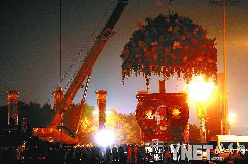 昨日21時(shí)30分,記者在天安門廣場上看見,在先期園林工人將“花籃”下的盆花清理出空間后,在一旁等待的三臺(tái)吊車馬上開始作業(yè)。隨著“起!”的口令,一臺(tái)吊車將大“花籃”的“提手”輕地吊在了空中,而后,在工作人員的手勢指揮下輕輕放在地上;隨后,再將“花籃”上盛滿仿真花卉的巨大“花缽”吊下來;最后吊下的是“花籃”籃體。園林工人們則熟練收起“花籃”中的仿真花,并根據(jù)大“花籃”的結(jié)構(gòu)對(duì)它的部件進(jìn)行分解,一個(gè)多小時(shí)的時(shí)間,大“花籃”被分解成三部分,吊車再將每一部分吊上貨車運(yùn)走。大“花籃”分解的同時(shí),另一部分園林工人則將“花籃”周邊的鮮花裝車清運(yùn)。23時(shí)30分,與大“花籃”相映襯的10余萬盆鮮花運(yùn)走了六分之一左右。市園林綠化局城鎮(zhèn)綠化處周劍平處長告訴記者,昨夜園林工人連續(xù)作業(yè),拆解花籃和裝運(yùn)鮮花,今天清晨,天安門廣場將做到場光地凈。