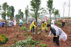 國家林業局常務副局長李育材,重慶市委常委、副市長馬正其等,手拿著鐵鏟,栽種了7棵大香樟樹。