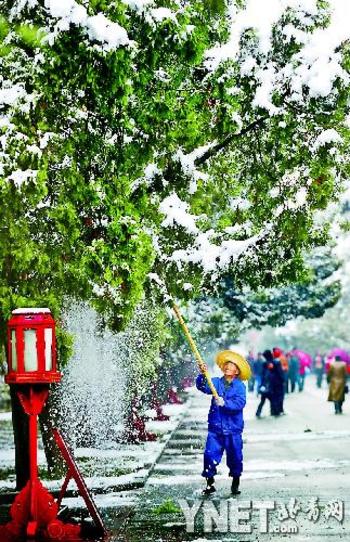 11月1日,北京市園林局發(fā)出《關(guān)于緊急處理雪天樹枝積雪的通知》,要求各區(qū)園林綠化主管部門全面啟動(dòng)雪天應(yīng)急預(yù)案,安排全體職工對(duì)轄區(qū)內(nèi)樹木特別是臨街樹木、古樹進(jìn)行清雪處理。