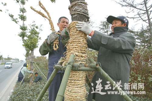 昨天,市園林工人在為花果山大道上的大樹穿“棉衣”。隨著氣溫的下降,市園林部門利用繩、防凍膜給今年新栽種的萬余棵大樹穿上“保暖外套”,確保樹安全越冬。