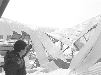 采訪中,記者了解到,塔橋村花卉基地的另外幾棟大棚同樣也被這場大雪壓塌,而且這些新建的大棚都沒有完工。工地負責人納先生稱,由于大棚的頂面設(shè)計成了波浪形,中間的凹槽主要是用來排水的,但沒有想到連續(xù)的降雪,使得中間的凹面堆積了大量的雪水,才造成了大棚的垮塌。