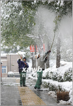 為了防止積雪再次損害樹木,市容園林局綠化處昨日專門安排綠化養(yǎng)護(hù)工人100多人上街給樹掃雪。昨天上午9點,全市100余名綠化工作人員手持竿對二環(huán)、三環(huán)、浐灞路等主要路段積雪較厚的灌、喬木進(jìn)行掃雪。記者 周瑞