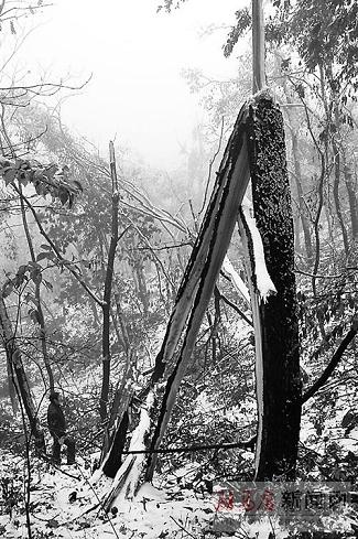 昨日是封山后的第3天,記者來到金頂山景區(qū)時(shí),這里仍是一片冰凍世界,成片的林木被覆冰攔腰折斷。有的林木被連根拔起,倒伏在山間和路邊。冰災(zāi)前還是郁郁蔥蔥的森林只剩下殘缺的樹桿,景象十分凄慘。