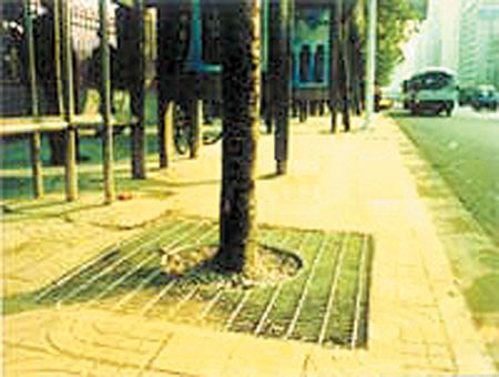 用透水混凝土來治黃土裸露效果固然好,但從景觀角度考慮并不是很美觀,所以“三中路”改造中大部分行道樹的樹池上,鋪上了一層高分子玻璃鋼材料或復(fù)合型聚塑材料,這兩種新材料在透水性、透氣性性能上十分優(yōu)越。且網(wǎng)格狀的設(shè)置,從外觀看非常漂亮。最主要的是其有著透水混凝土不具備的優(yōu)勢,有一定的伸縮性。行道樹在生長過程中,樹根經(jīng)常會(huì)把水泥或泥塊頂起來,從而影響景觀,而高分子玻璃鋼材料或復(fù)合型聚塑材料能承受一定的彎曲。