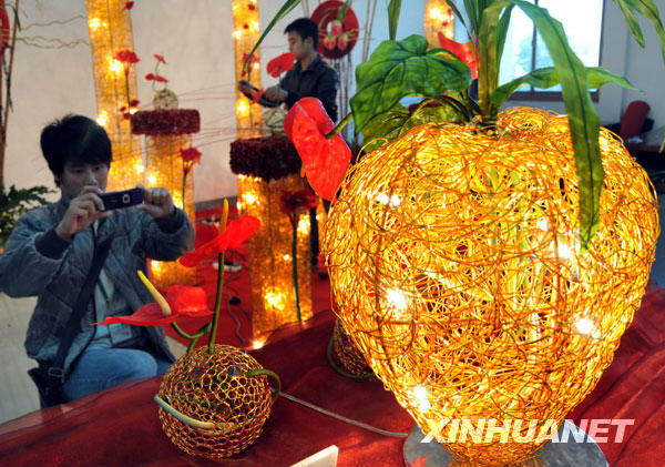 11月29日,一名參觀者用手機拍攝插花作品。新華社發(孫炳春 攝)