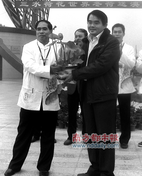 澳門民政總署綠化部綠化處處長麥肇鵬(右)接過了三水荷花世界贈送的荷花。