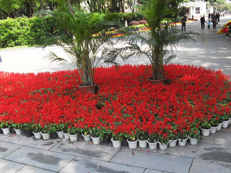 一串紅花序修長,色紅鮮艷,花期長,適應性強,為中國城市園林中最普遍栽培的草本花卉之一,廣泛分布我國各地。一串紅在秋天里把城市打扮成一個紅艷艷的喜慶的世界,一串紅既給人以色彩的喜悅,還給人以紅火的喜慶。近看,一串紅像小火苗,像小姑娘,又像一串小鞭炮。遠看,一串紅像一片燃燒了的火焰,像一群穿著紅色演出服的姑娘,還像一片美麗的彩霞。