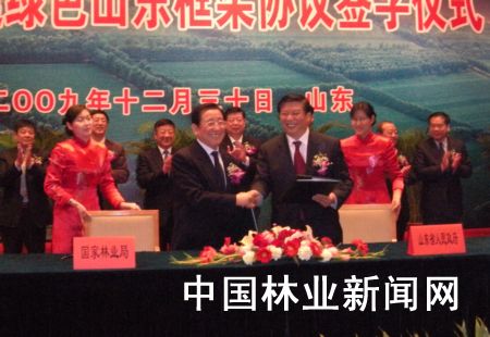 12月30日,國家林業局、山東省人民政府合作共建綠色山東框架協議簽約儀式舉行。國家林業局局長賈治邦、山東省省長姜大明分別代表雙方簽字。協議提出合作共建的發展目標是,力爭建成城鄉一體、布局合理、結構優化、功能完備、林權明晰的現代林業體系。