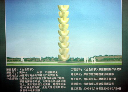 思想和行動高度統一——鄭州在建的一座名叫“金色的夢”的雕塑上,將要貼上了1公斤98%的金箔。有網友稱不如直接把黃金貼到領導臉上,還有人調侃要去偷雕塑回家煉金。