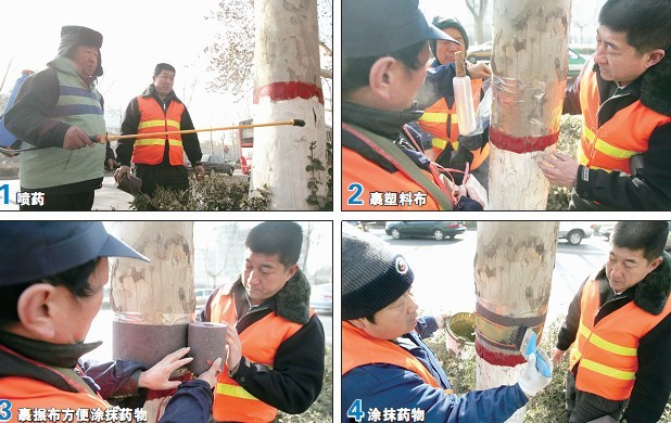 據介紹,此次給樹木綁“藥環”的街道包括中山西路(西二環至西里街)、虹光街、市政路、友誼大街等街道,涉及5000余株樹木。其中絕大多數為法桐。整個綁“藥環”工作將持續兩周左右。“藥環”可以截殺早春時節上樹的草履蚧若蟲,使其不能上樹吸食樹木汁液。