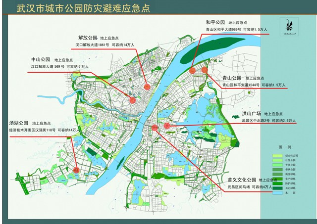 據武漢園林局提供的消息:目前,經武漢市應急辦確認的市級城市公園防災避難應急點有6個:中山公園、解放公園、洪山廣場、和平公園、湯湖公園、武昌首義文化公園。