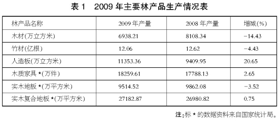 2009年,為有效應對國際金融危機對我國林業產業的影響,國家林業局、國家發展改革委、財政部、商務部、國家稅務總局聯合印發了《林業產業振興規劃(2010~2012年)》,進一步明確了林業產業發展的指導思想、基本原則、目標任務和主要措施。截至2009年11月底,全國規模以上林業工業企業生產情況逐月好轉,林業產業發展基本面保持穩定。