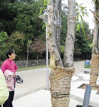黃隊長介紹說,2008年的寒災(zāi)過后,他們對綠化植物受到的損害做了調(diào)查、分析和總結(jié),并制定出了一份植物冷害等級劃分的方案。針對今年的情況,黃旭光稱,他們根據(jù)氣象部門的中、長期天氣預(yù)報,并結(jié)合當(dāng)年秋季及冬季的氣候條件,針對不同生態(tài)習(xí)性的植物采取了不同的御寒措施。如冷害來臨前給樹木灌水,保持地溫和樹溫;給易受害的苗木噴灑防凍劑;對一些高大的喬木,用草繩和塑料薄膜進行樹干包裹,或在樹干涂石硫合劑進行保護。對于在2008年寒災(zāi)后補種的樹木,因為生命力還較弱,日常的護理工作將會做得更細致。