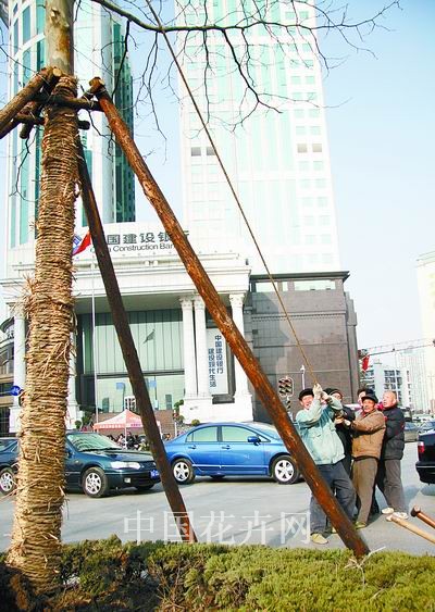 圖為園林職工正在扶正新栽的法桐。  張垠 攝