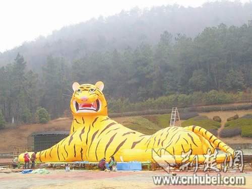 為迎接虎年的到來,九峰森林動(dòng)物園內(nèi)矗起一座高9米、長24米的巨型虎燈——福虎,此虎燈的規(guī)模是中南最大、全國第二。此虎燈由來自四川自貢的彩燈工匠們歷時(shí)1個(gè)月打造而成,光鋼材就用了5噸。虎燈是為該園2月11日開幕的“九虎爭春”民俗趣味游園會(huì)打造的,可發(fā)出震撼的虎嘯聲。(查昭)
