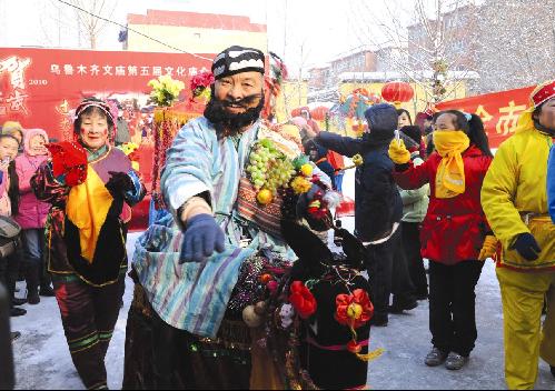 伴隨著喧天的鑼鼓聲,騎著“毛驢”的“阿凡提”大叔扭著帶有濃郁新疆舞蹈風(fēng)味兒的秧歌;趕毛驢的大媽箍著白手巾貼著白胡須裝起了“老漢”;扭秧歌的大爺涂上紅臉蛋系著紅頭巾扮起了“婆婆”……這就是春節(jié)前,烏魯齊市文廟精彩的社火表演。