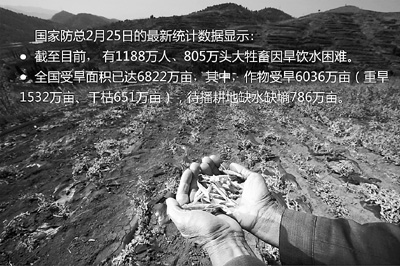 國家防總2月25日的最新統計數據顯示,截至目前,有1188萬人、805萬頭大牲畜因旱飲水困難,分別比多年同期均值多424萬人、311萬頭,主要分布在云南、內蒙古、河北、甘肅、遼寧、貴州、山西、四川、廣西及重慶等。▍^、市)的偏遠山丘區。