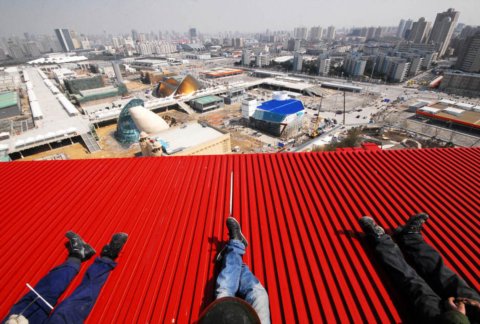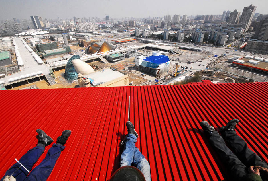 2010年3月10日,上海世博會12日即將迎來開幕倒計時50天。圖為工人在中國館屋頂俯瞰即將完美亮相的世博會亞洲館區。