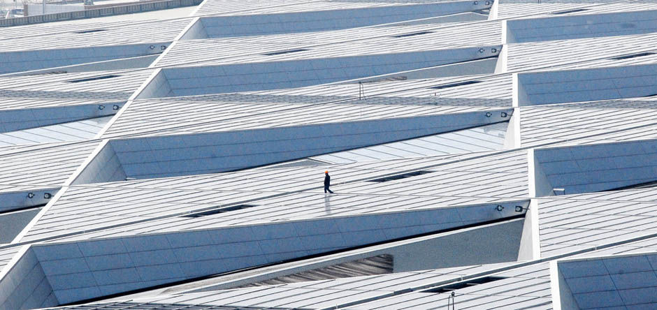 2010年3月10日,上海世博會12日即將迎來開幕倒計時50天。圖為工人在上海世博會最大的太陽能屋面