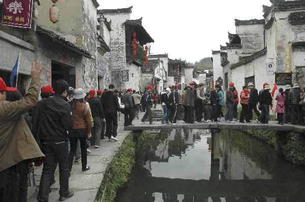4月3日,眾多游客在江西婺源李坑景區游覽觀光。新華社發(單長華攝)
