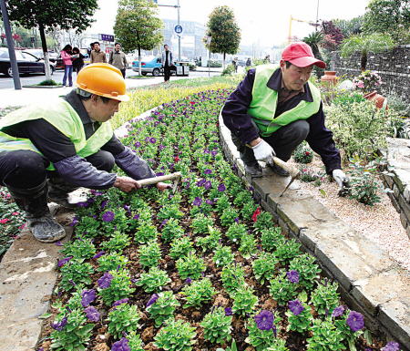 連日來,我市城管、園林部門抓緊在城區主要街頭綠地布置“花境”。此次“花境”布置以迎接上海世博會為內容,目前,全市范圍內計劃布置的600處“花境”任務已完成過半,預計在本月底可全部完工。“花境”是一種新型的園林藝術形式。圖為昨天下午,幾名花匠正在大沙泥街西側擺放“花境”。