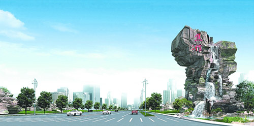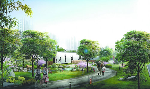 “智學興城”段位于神州路與濱河路之間,路側的主要單位為河南理工大學。本段設計突出休閑性,以自然流暢的休閑園路貫穿其中,兩側地形起伏變化,形成步移景色異的景觀效果,沿園路點綴小型休憩場所,或放置幾塊古樸頑石,上刻古典詩詞幾句;或設計藝術景墻一片,雕刻一些富有文化氣息的圖案;或設計臺階花池一處,為廣大師生的晨讀提供幽雅的場所,形成文風濃厚、可游可品的道路景觀空間。該段小品以焦作歷史文化名人和地域文化為主題,點狀布置小型景觀節點,體現焦作人杰地靈、人才輩出的地域特色,如孔子、林七賢、朱載堉、韓愈、李商隱等歷史文化名人的相關資料,形成具有濃郁地域文化氣息的景觀,既體現了焦作地域文化,又對廣大學子有教育意義。