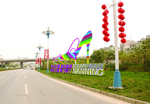布置線路二:民族大道全段(埌東三岸收費站—翡翠園—榮和山水美地—航洋國際—南湖橋頭—新民立交橋)。其中,民族大道三岸收費站“首尚南寧”造型:以掛著標簽的紳士帽為設計元素,融入民族色彩、壯錦元素,造型絢彩奪目,時尚大方。寓意為將南寧營造為時尚購物天堂。