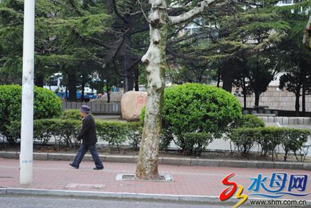 昨日上午10點半左右,雨過天晴。記者來到南通路南首的毓西園附近。走在南通路西側的人行道上,記者仔細觀察了附近每棵 樹的“長相”,沒發現有啥特殊之處。當記者來到道路東側一家蒸包王店鋪時,驚奇地發現,對面果真有棵與人面相像的樹木。