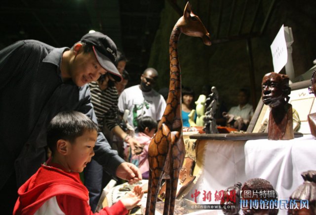 5月1日,上海世博會開園第一天,非洲聯合館內陳設的工藝品吸引了一對父子游客。