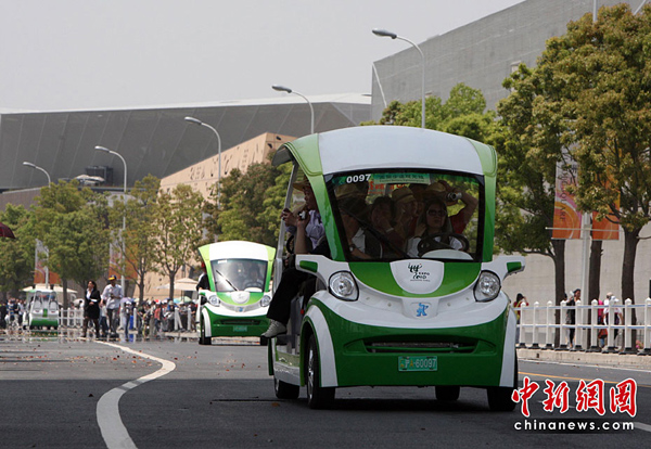 5月2日,上海世博會是第一個正式提出“低碳世博”理念的世博會,圍繞著這樣的理念,上海世博園區內的低碳元素比比皆是。圖為世博園區有幾百輛零排放的燃料電池汽車向游客提供服務。中新社發 湯彥俊 攝