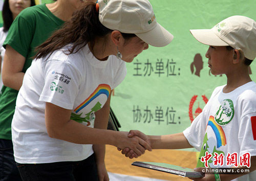 圖為蔡敏女士為北京第二聾人學校的兒童頒發“最佳小組獎”。