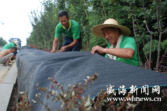 為避免夏季烈日對綠化植物造成傷害,我市園林工人冒著酷暑對市區(qū)一些綠化帶覆蓋遮陽保護網。這是7月31日,記者在市區(qū)古山五巷拍攝的鏡頭。(記者 王曉 攝)