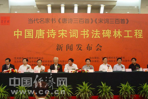 上午,當代名家書《唐詩三百首》、《宋詞三百首》暨中國唐詩宋詞書法碑林文化工程新聞發布會在人民大會堂舉行。中國唐詩宋詞書法碑林工程總策劃白景峰會上表示,建成后它將是中國第一座以“唐詩宋詞”命名的書法碑林,并具有“當代中國書法博物館”的功能。