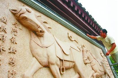 昨天,工作人員在為“秦瓊戰(zhàn)馬”像做最后的粉飾。當(dāng)日,一幅以“秦瓊戰(zhàn)馬”為題材的大型浮雕壁畫在五龍?zhí)豆珗@亮相,該壁畫為砂巖質(zhì)地,采用傳統(tǒng)的浮雕技藝制作而成,畫中兩匹戰(zhàn)馬立體生動(dòng),好似將從畫中躍出一般。據(jù)了解,這幅壁畫是在建中的五龍?zhí)缎戮包c(diǎn)“秦瓊府邸”的重要組成部分,目前“秦瓊府邸”的主體已完工,施工人員正在加緊布展,力爭在十一期間對(duì)游客開放。 記者崔健 攝