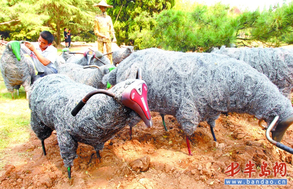 臨沂園的建設讓人眼前一亮。在一片人造的沂蒙山上,一名“牧羊人”正趕著一群“羊”,行走在回家的路上。“羊群”共有15只“羊”,全都是用廢舊的自行車固件、鋼絲球等制成。臨沂園取名為“歸”,既是呼喚人們回歸自然、回歸原野,又倡導對廢舊材料回收利用。