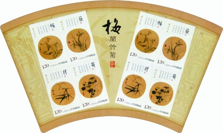 10月18日即將發行的《梅蘭竹菊》特種郵票全套4枚,另發行小型張1枚。不是單純地表現花草觀賞性,而是更多地表現花的文化內涵。花中四君子首次匯聚在方寸天地,是中國花卉郵票的一個新突破。而且,小型張采取傳統扇面的獨特形式,為新中國郵票版式之首創。