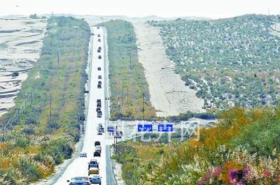 這是綠化帶掩映下的塔里沙漠公路。為防沙固沙,沿塔里木沙漠公路全線形成阻、固、輸、導、控相結合的防沙體系,僅北段公路編扎的蘆葦方格面積就達2000萬平方米。截至目前,全長436公里、寬度為72米到78米的綠化帶全部建成,總面積達3128公頃。