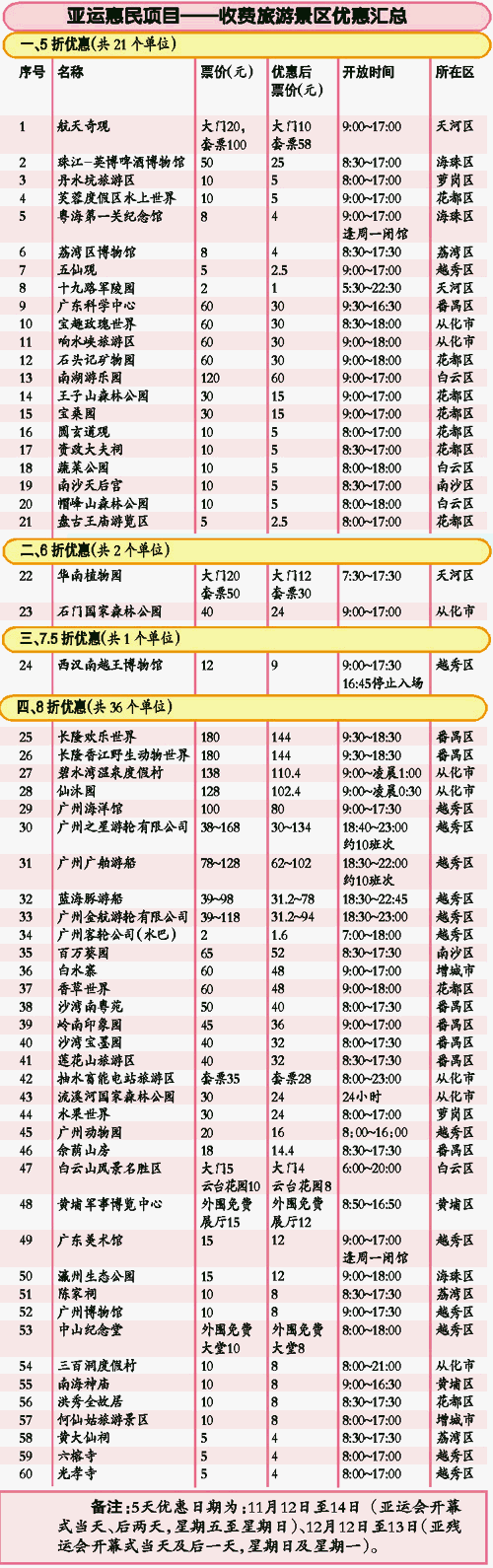 昨日,廣州市內各大風景區和公園齊齊同步對外發布了亞運期間精彩節目安排和優惠措施。從節目來看,既有專為亞運準備的國際盆景頂級展覽,又有男女老少都喜歡的“七彩花田”動漫童話世界,游客在賞花游園之余,還可以一睹兀鷲、禿鷲、牦牛等亞洲高原動物和新落戶廣州大熊貓的趣致!從優惠措施來看,收費景區門票實行5~8折優惠,最低門票價格僅1元。