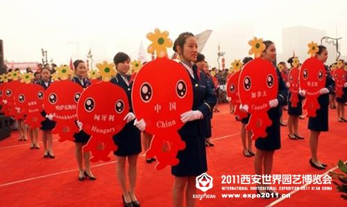 禮儀小姐手持2011西安世園會吉祥物造型的參賽國家和地區代表牌