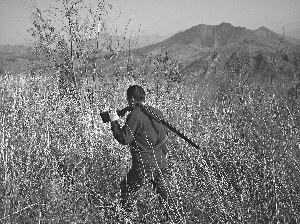 一小時間,獵手們在掛扯衣服的荊棘和削尖的荊條茬間穿行,除幾枚褪色的蛋殼外,一無所獲。偶爾有一只山雞從身邊猛然躥起,但沒等獵手反應,山雞已快速飛出,然后落在跟它相同顏色的雜草叢中。